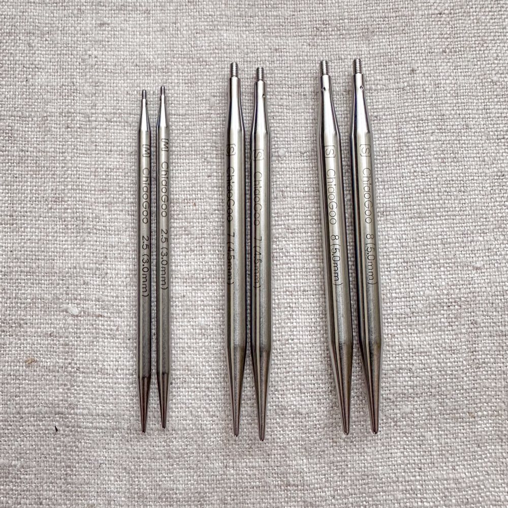 When connected with a cable (sold separately), ChiaGoo interchangeable tips become high-quality circular needles. Made from surgical-grade stainless steel, they are designed for long-term use and allow stitches to glide smoothly, making your project easier to progress. The transition between the cable and the needle is seamless. Needle sizes are laser-engraved on each tip, along with the corresponding cable size to use.