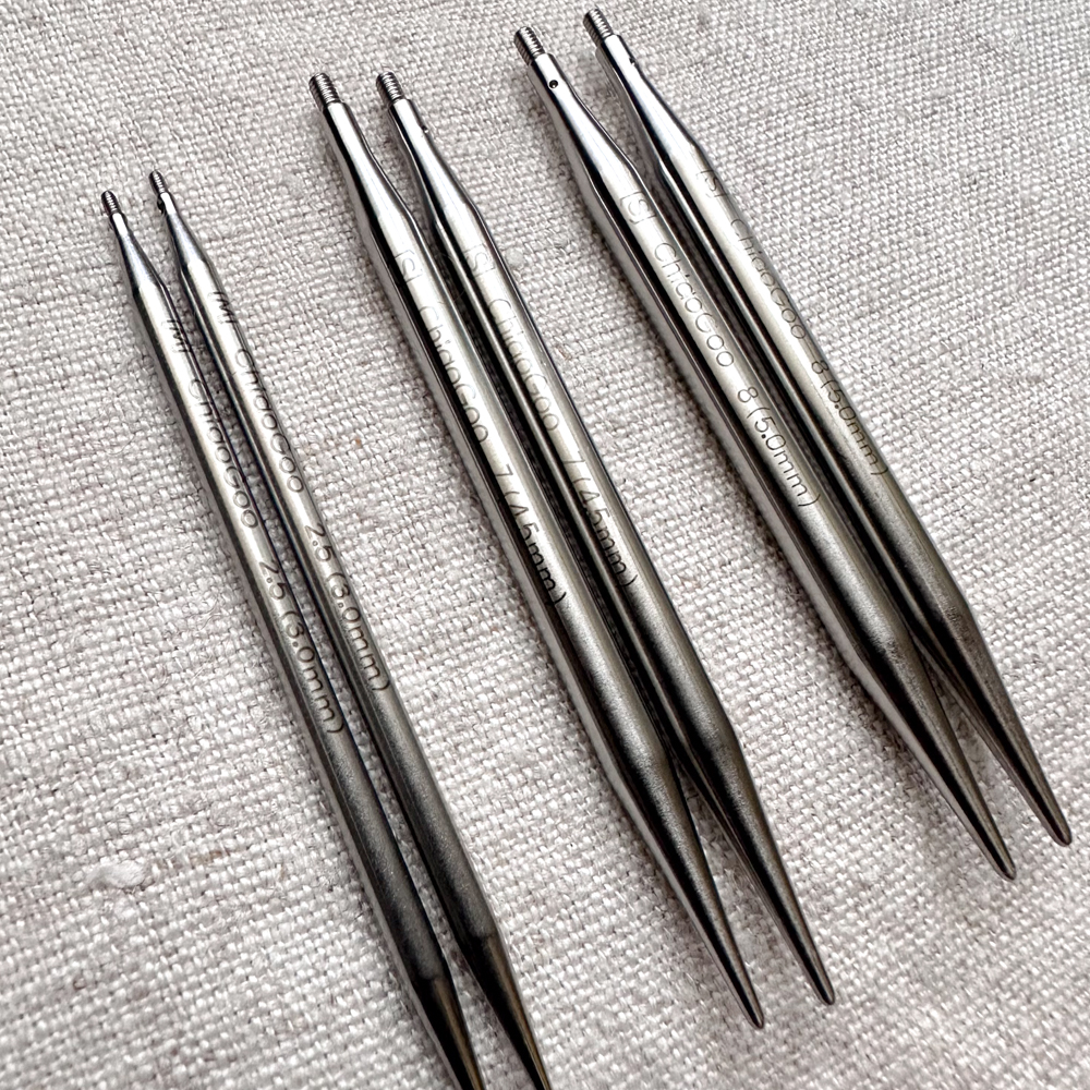 Reliées entre elles grâce à un câble vendu séparément ici, les pointes interchangeables ChiaGoo deviennent des aiguilles circulaires d’excellente qualité. En acier inoxydable chirurgical, elles s’utilisent dans la durée et laissent glisser les mailles de votre projet afin de faciliter sa progression. La transition entre le câble et l’aiguille se fait en douceur. Les numéros d’aiguilles sont gravés au laser sur chaque pointe ainsi que le câble à utiliser.