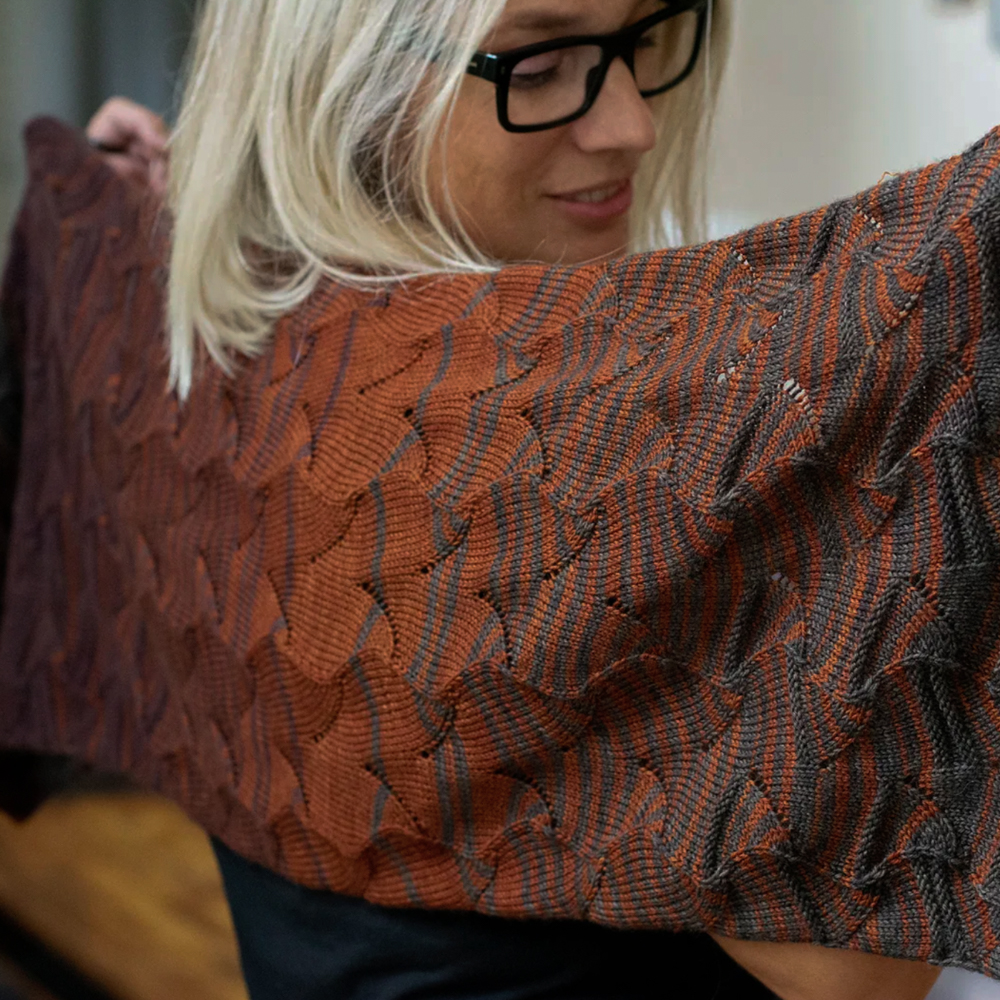 “Laissez-vous inspirer par un dégradé de lierre grimpant sur vos épaules. Facile à tricoter, ce modèle vous ravira par ses variations de textures et de couleurs tout au long de sa réalisation.” Béatrice